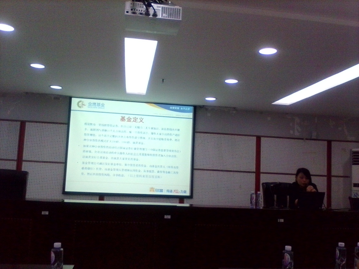 首先朱丹师姐为我们讲解了基金的各种相关知识,如基金的基本知识、各类难得一见的历史分析数据、不同种类基金如何操作,以及如何进行投资组合分散风险等。之后,学姐以自身经历入手,向我们展现一个基金经理人的职业风范,并给我们总结了几条职场建议:一是必须要有一颗学习的心态让自己不断地吸收新鲜事物,其次要有归纳意识和演绎能力,将各种信息汇总,归纳总结出简洁有效的最终信息,然后要注重人际沟通,从和他人的交流中获取对自己有用的信息。最后朱丹师姐着重强调的一项内容就是要积极乐观,以良好心态应对工作,不要因为当前的不顺畅就郁郁寡欢,要依然保持昂扬的斗志,不断进取,充实自己的人生。