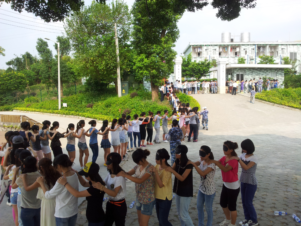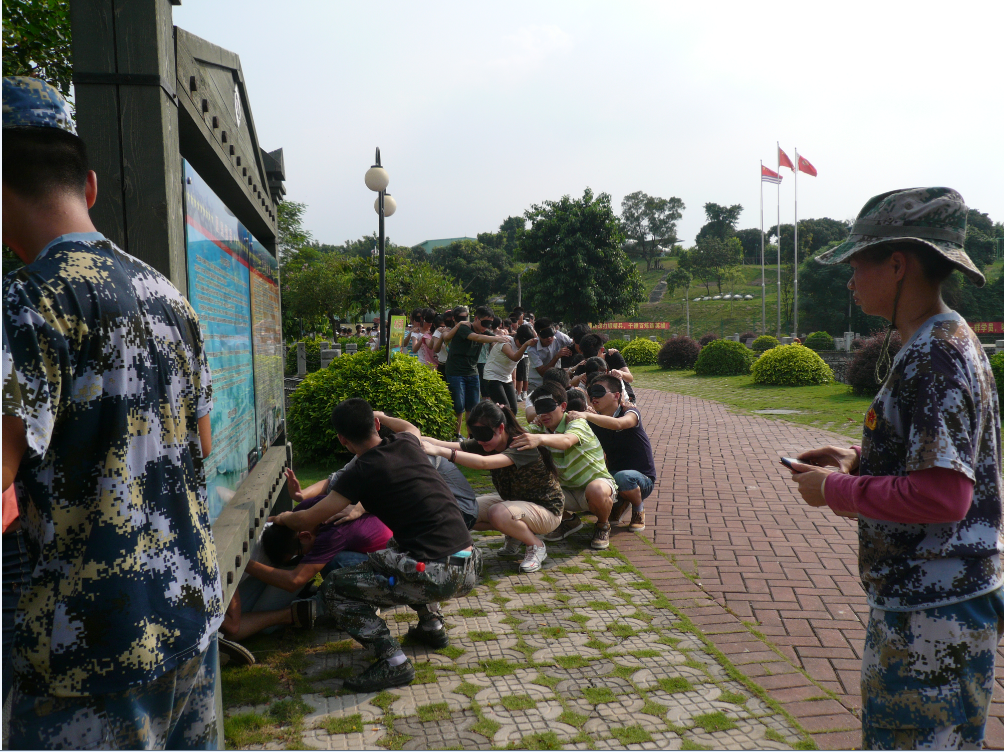 第一个进行的拓展项目是驿站传递。每组排成一纵队,教练拿一张写着数字的纸给最后一个人看,最后一个人在前面的人背上写这个数字通知前方,大家要不能出声的把数字从后至前传递,最后接受信息的人把数字反馈给教官。游戏的过程紧张而又有趣,大家都全力以赴,不甘落后。但游戏的最终结果表明懂得组织合作和纪律的团队容易胜出。