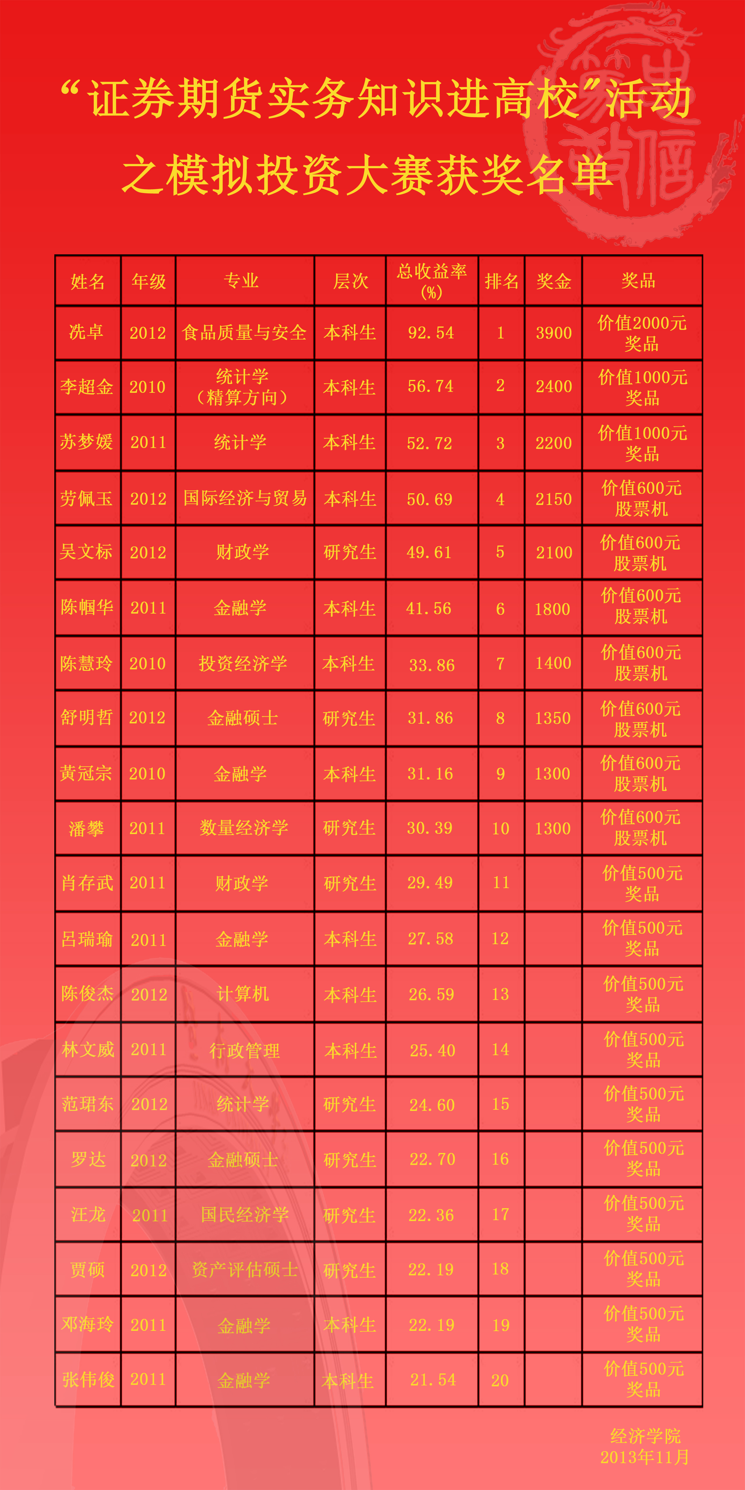 “证券期货实务知识进高校”活动之模拟投资大赛已闭幕,现将获奖名单公布如下,以示鼓励。