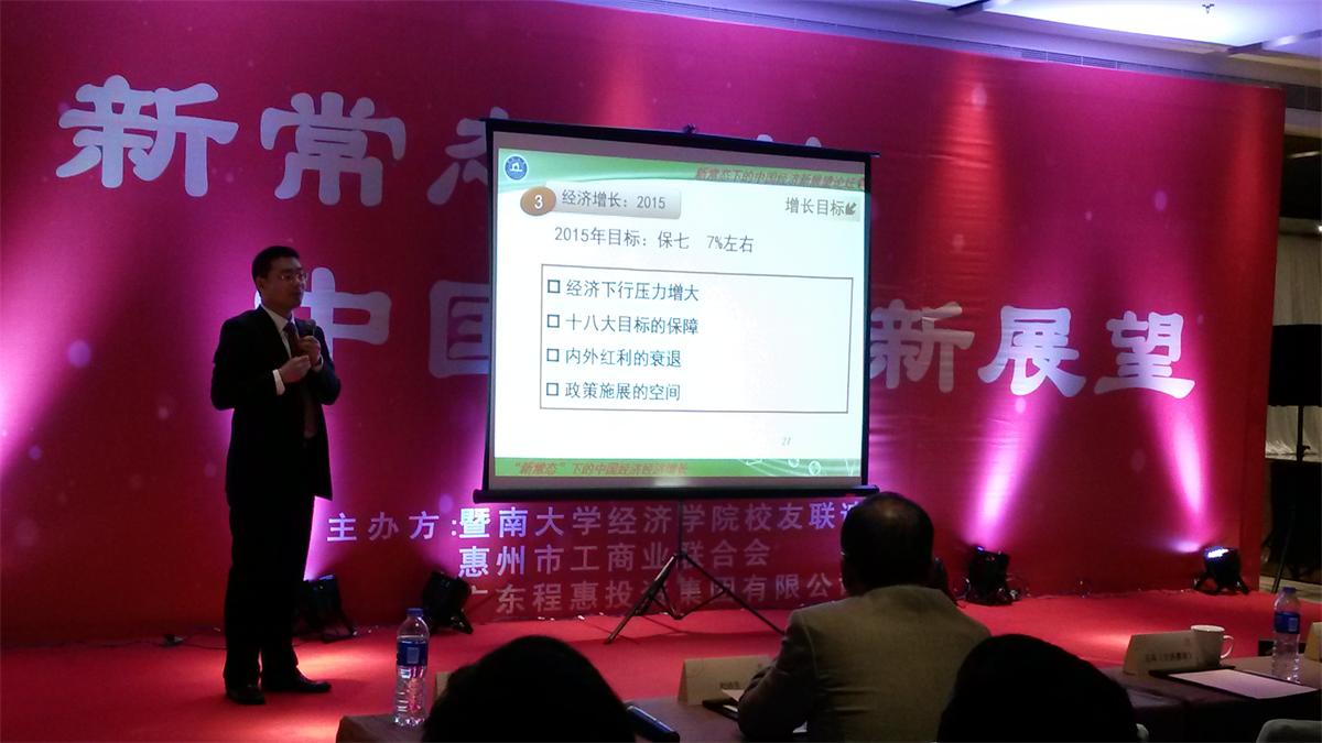 2015年1月1日下午,beat365英国官方网站校友联谊会、惠州市工商业联合会与广东程惠投资集团有限公司在惠州市共同举办“新常态下的中国经济新展望”论坛。我校刘洁生副校长出席论坛并致辞。本次论坛由经济学家郎咸平教授和我院经济学系主任王兵教授同台主讲,在新年之际为听众献上了一场学术盛宴。