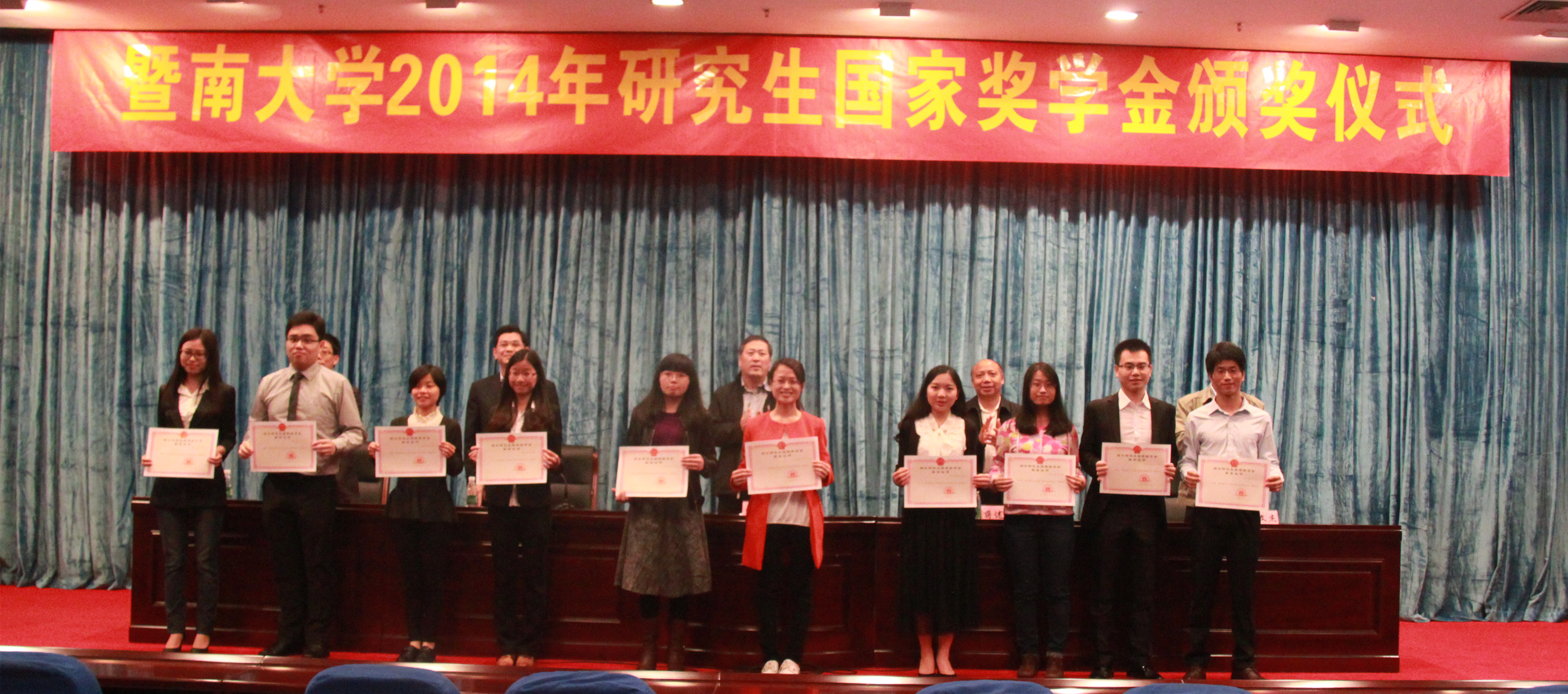 2015325下午,beat365英国官方网站在曾宪梓科学馆国际会议厅迎来第一届研究生国家奖学金颁奖仪式,表彰2014年研究生国家奖学金获得者。胡军校长、蒋述卓书记、林如鹏副校长将参加颁奖仪式。学校领导肯定了获奖者的成绩,并期待他们创造新的辉煌。我院共32人获此荣誉,其中博士5人,硕士27人。我院研究生付辉、何意銮分别作为博士、硕士代表上台领奖。希望获奖同学再接再厉,争做学习模范;更期待其他同学以他们为榜样,力争上游,形成一股互相学习、不甘落后的学习风气。