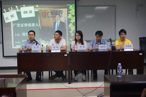 在广发证券工作的2006级国民经济学专业研究生的汪柯介绍了介绍了投资行业的基本业务情况,并分享了工作多年来获得的一些经验和教训, 以及他考取保荐人资格证书的历程,并用自己的实际经历告诉我们考证的重要性。此外他还分析了如今投行、基金公司、证券公司、银行等金融行业的前景和薪水情况,并说“在工作初期,难免辛苦;但从长期来看,只要肯努力,付出总会有收获”,并鼓励同学们珍惜在校的时间,好好学习,努力充实自己。