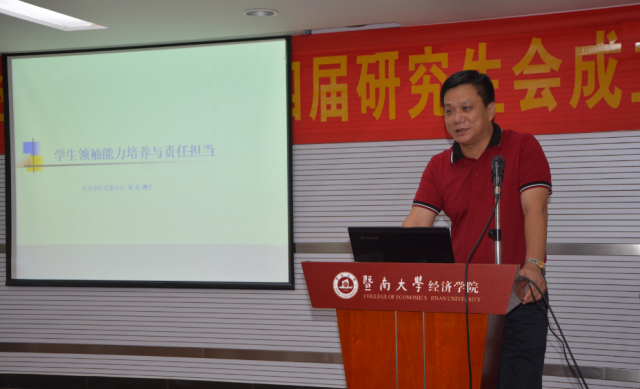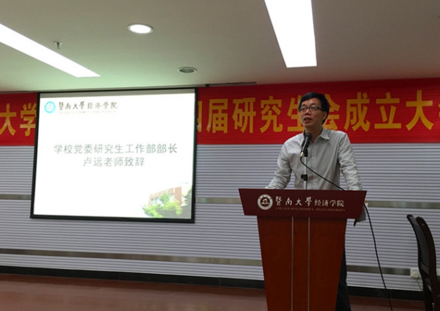 卢远部长代表党委研工部致辞。他感谢同学们的奉献精神,并结合自己的工作经验向同学们阐述了暨南精神,希望同学们能够为了善去无私奉献,而不应为了回报而去付出,并对在场学生干部提出了几点希望:明确职责,升华认知,摒弃官僚主义;履行职责,严于律己,发挥先锋模范作用,最后他以一首自创的七言诗《秋雨》勉励大家要在思想上做到忠信笃敬,在行动上做到知行合一。