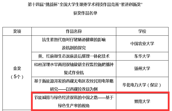 近日,第十四届“挑战杯”竞赛全国大学生课外学术科技作品竞赛组委会公布了“累进创新奖”获奖作品名单,全国共有5项作品获得该奖项的金奖,我院2013级国民经济学研究生刘光天的作品《节能减排与绿色经济双赢的中国之路——基于绿色生产率的视角》获此殊荣,指导老师是王兵教授。
