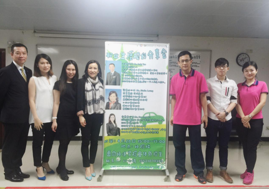 香港宏星集团区域总监梁美桦女士以轻松的问答活跃了现场气氛,为现场同学分享了她的行业经历和体会:“不仅把顾客当做顾客,更要把顾客当朋友。”她认真地与大家分析了财务策划行业的趋势,并简要介绍了理财规划的具体工作。