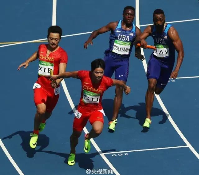 (4x100米决赛现场苏炳添正接过队友的接力棒)