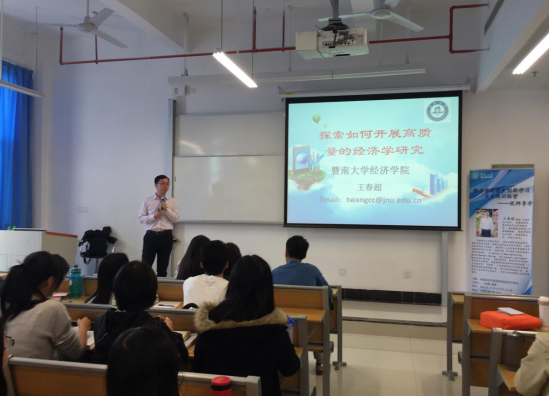 随后,王春超老师通过分享自己的创作经历,提醒同学们要通过模型思考经济问题,多多关注国内外研究现状。讲座中,王春超广泛举例,如以“蛋”和“鸡”的模型为例,引发同学们的思考和发散性思维,切入“内生变量”和“外生变量”的概念;并从自己在做研究、写论文时遇到的问题和困难入手,为同学们提出了富有建设性的研究方法和建议。此外,王春超老师还鼓励同学们积极参与多种形式的学术活动,开阔学术视野,分享了参加学术活动的渠道和经济学系的学术公众号“经济学苑”,并为大家推荐值得学习和阅读的经济学著作。