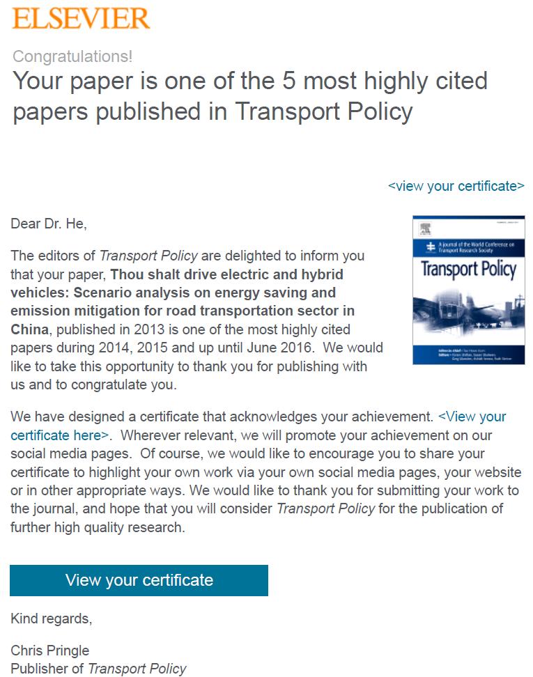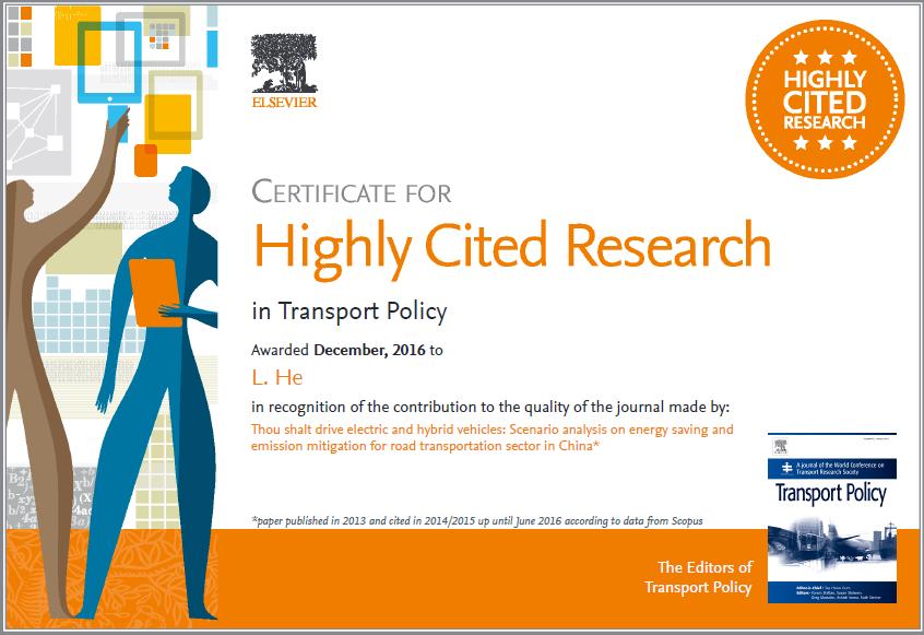 近日,我院何凌云教授2013年发表于 Transport Policy ( SSCI检索,经济学 Q1 分区期刊) 论文(合作者:Yu Chen):“Thou shalt drive electric and hybrid vehicles: Scenario analysis on energy saving and emissionmitigation for road transportation sector in China”被评为Transport Policy 2014-2016高被引论文(期刊引用前五)。