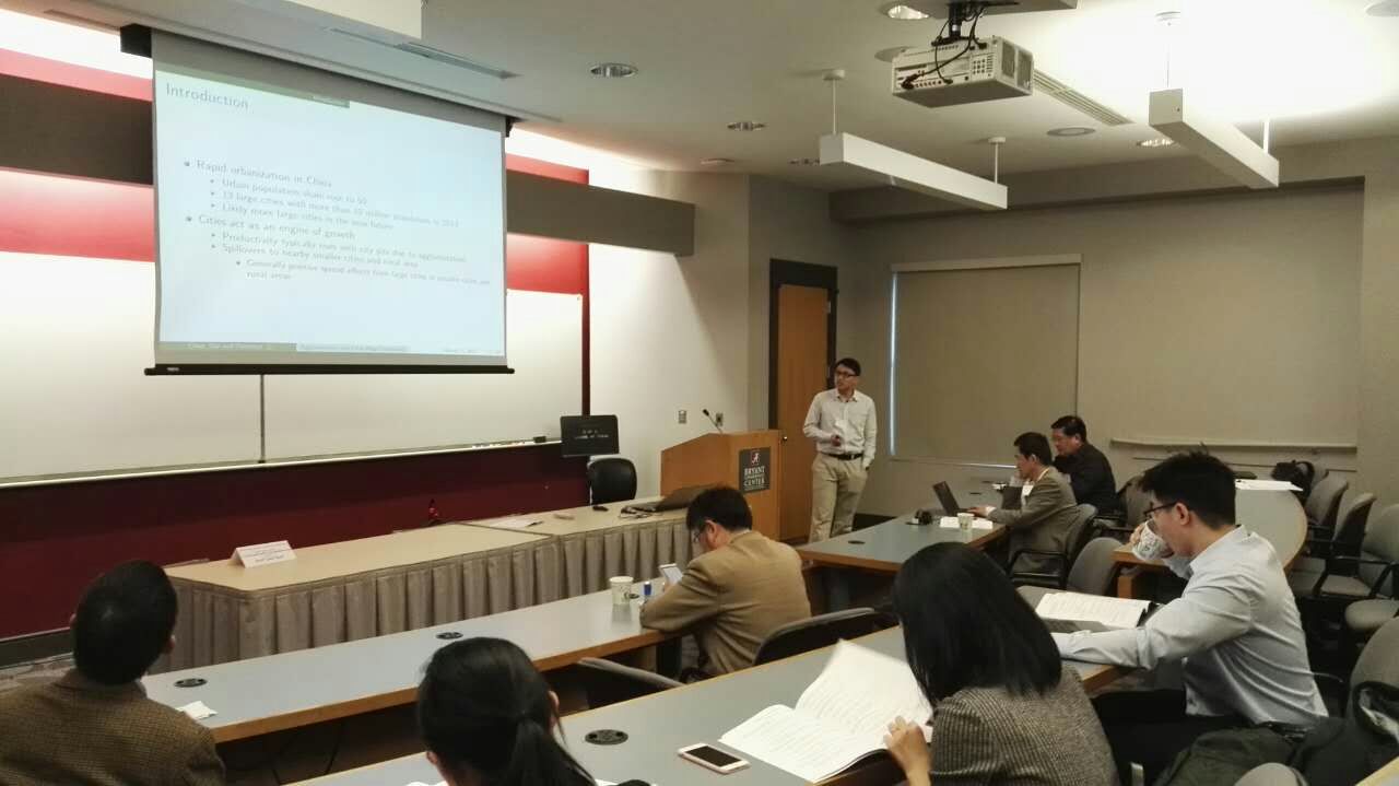 种照辉是我院区域经济学博士生,现在美国肯特州立大学访问,他报告的论文是“Environmental Regulation and Industrial Structure Change: Integrating Spatial and Social Network Analysis” (合作者是我院覃成林教授和肯特州立大学的叶信岳副教授)。该文探讨了环境规制政策对于城市群产业结构的影响及其溢出效应,重点关注了不同网络矩阵下的溢出渠道问题。研究表明,环境规制对于城市群的产业结构升级有显著地促进作用,反映城市对环境保护态度的社交媒体网络是溢出效应的重要渠道。张锦意是我院金融系博士生,现在美国堪萨斯大学访问,他报告的论文是“The Chinese Bank Capital Buffer and Risk-taking: Impact of Regulatory Change and Business Cycles” (合作者是我院蒋海教授和奥本大学的James R. Barth教授)。该文使用140家商业银行2004-2015年面板数据,实证检验了资本缓冲对银行风险承担的影响,控制了银行个体特征、监管环境改变和经济周期的影响。研究表明资本缓冲有助于减少银行的风险承担,但是这种影响对资本监管环境的改变较为敏感。王雪为我院金融系博士,现在堪萨斯大学访问,她报告的论文是“The Macroeconomic Effects of RMB Internationalization: from the Perspective of Outside Circulation”(合作者是我院王聪教授)。该文建立了人民币境外流通量、汇率、利率、通货膨胀率之间的SVAR模型,并运用有向无环图(DAG)方法对模型进行识别和同期因果关系分析。研究结果表明,存在“人民币境外流通量到通货膨胀率”,“汇率到境外流通量”以及“汇率到通货膨胀率”的同期因果关系,而利率的调整对宏观经济的影响存在时滞效应。