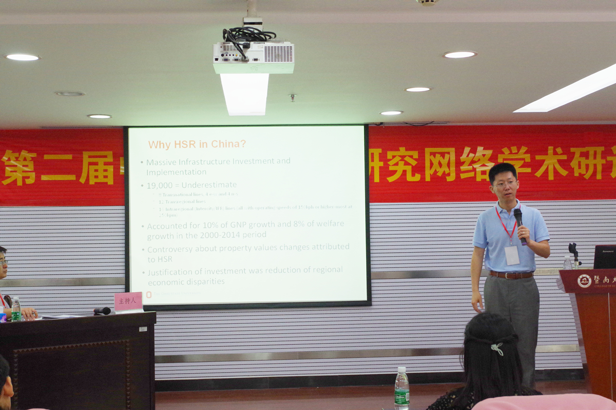 本次研讨会包括“高铁建设与区域/城市经济发展”、“高铁建设与空间结构演变”、“高铁建设与中国经济转型升级”和“高铁建设与经济空间组织”四个分阶段报告会。共有20余位学者在大会上汇报了各自的研究工作。其中,俄亥俄州立大学的陈振华助理教授作了题为“Impact of High Speed Rail on Regional Economic Disparity in China”的报告,指出高速铁路建设促进了2000-2014年中国区域经济收敛。明尼苏达大学的曹新宇教授作了“When and How Much Did the Green Line LRT Increase Single-Family Housing Values in St. Paul, Minnesota?”的报告,分析了美国明尼苏达州圣保罗市的绿线LRT开通对独栋住宅房产价值的影响。