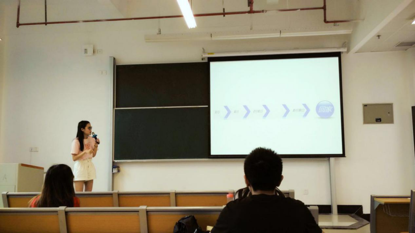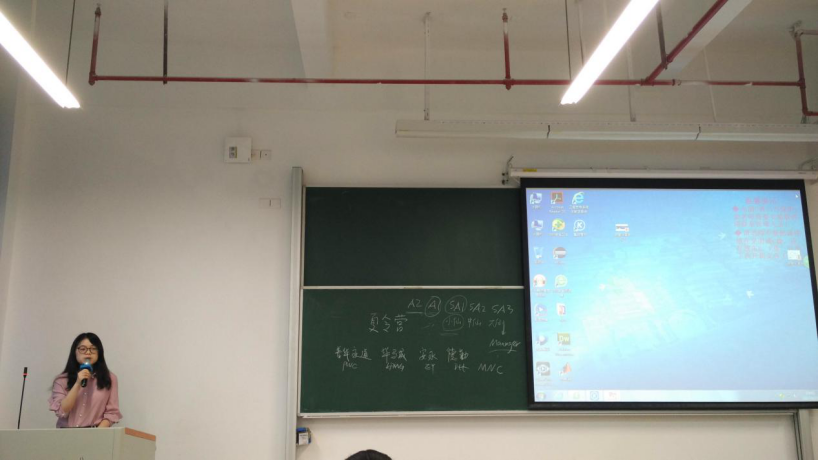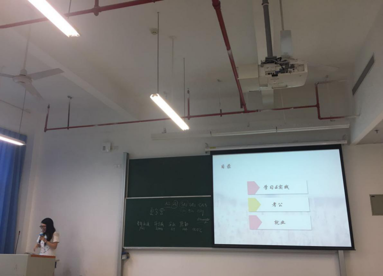 第一位分享者是平均学分绩点在班上排名第一的杜晓萍学姐。她现已被保送到中山大学管理学院,且已经是普华永道中天会计师事务所的TDP。她分享的主题是“遇见更优秀的自己”。作为班上唯一一个保研的学生,杜晓萍学姐对自己的保研之路深有感触。她提出,保研有两条途径,一是推免,二是参加夏令营。晓萍学姐回顾了自己申请参加中山大学夏令营的亲身经历。在大学学习生活方面,她介绍了自己在大三下学期参加德勤税务挑战赛的经历,以此鼓励大家在闲暇之余多参加活动,以增加学习经验、增长才干、积累人脉。在实习方面,杜晓萍谈起了自己在普华永道中天会计师事务所实习的经历,并告诫大家找实习时要善于甄别,尽量寻找那些有名气、靠得住、有保障的企业来实习。