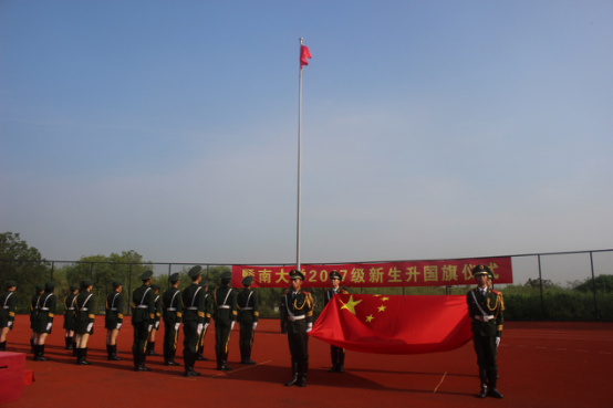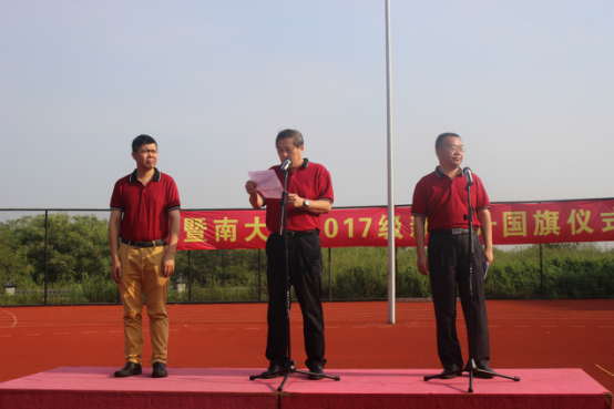 9月12日上午8点,在参加完武术训练后,beat365英国官方网站全体本科新生参加了番禺校区升国旗仪式。校领导胡军、张荣华、夏泉,相关院系部处的领导老师参加了升旗仪式。