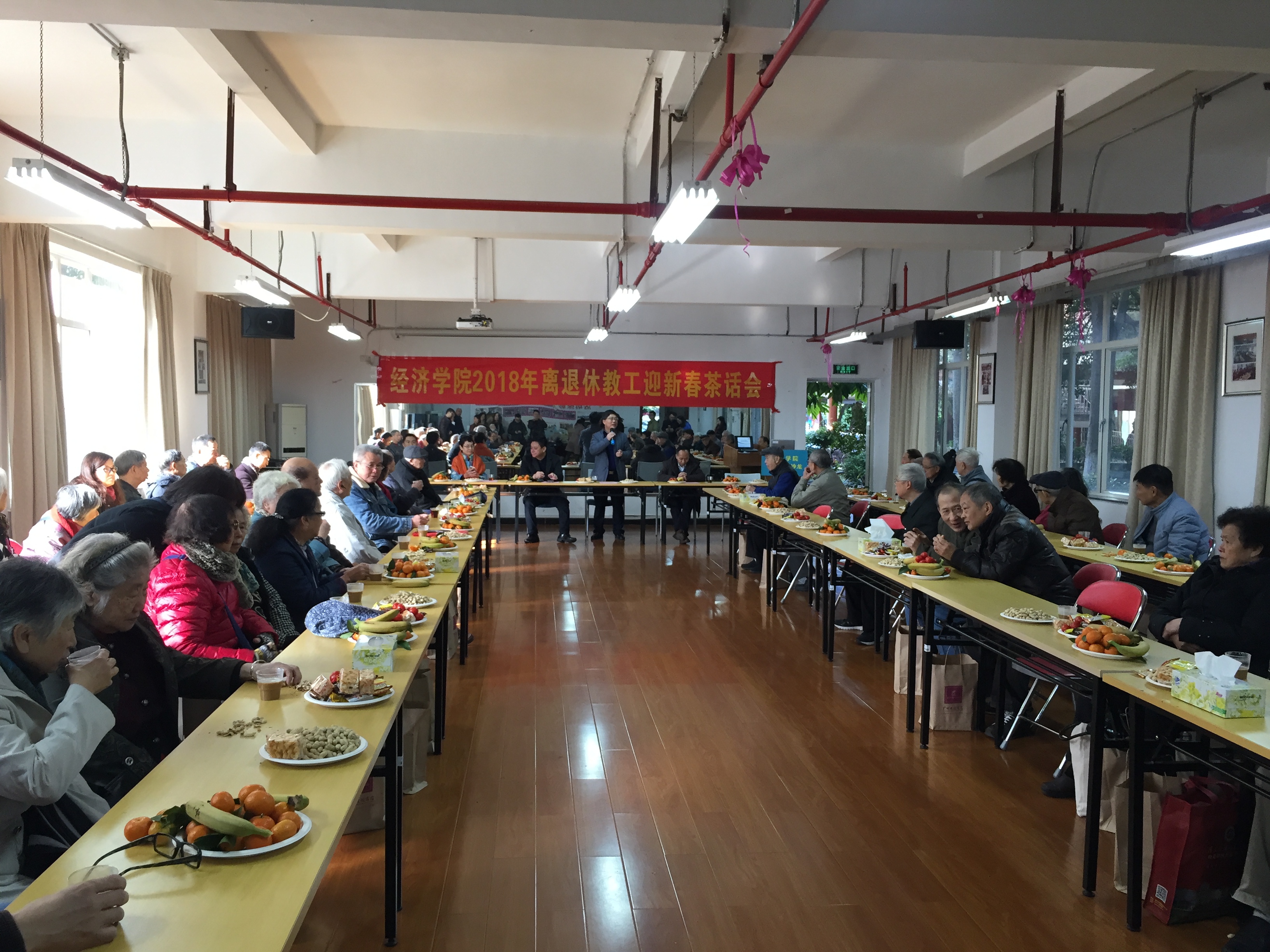 2018年1月11日上午,beat365英国官方网站在教工之家举行2018年离退休教工新春茶话会。学院领导刘少波、张志、王玉娟、刘德学、蒋海和各系所、各职能办公室负责人,以及60余名离退休教工欢聚一堂,畅叙情谊,喜迎2018年新春。学院党委书记张志主持茶话会。