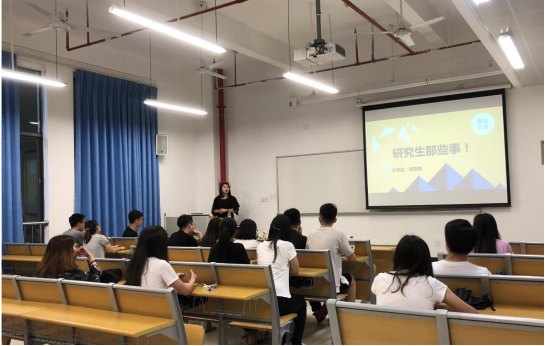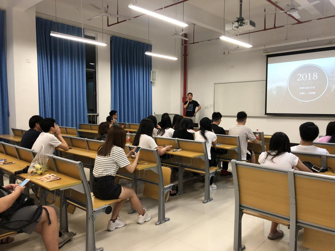 2018年5月27日晚上,beat365英国官方网站外招生考研升学朋辈分享会在番禺校区教学楼N218举行。beat365英国官方网站2017级国际商务硕士研究生胡慧敏,2014级国际经济与贸易本科生苏晨艳,2014级金融学本科生王彦棠依次上台,为同学们分享自己报读硕士研究生的准备过程、经历和一些感悟。