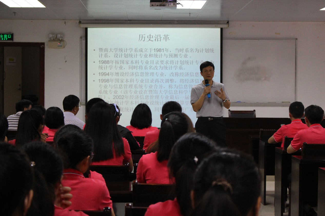 财税系林伟雄书记给新生介绍了系里的各位老师,告诉同学们要相互照顾,尊重不同地区的文化差异;并通过真实事例,告诫大家防范各种诈骗组织和诈骗手段。统计学系郑少智主任介绍了统计学的发展历史和基本现状,要求同学们学会掌握正确的学习方法,大学不同于高中,要学会灵活运用;多参加学术性比赛,例如“大创”、数学建模等,希望大家能静下心来好好学习,充实地度过大学时光。