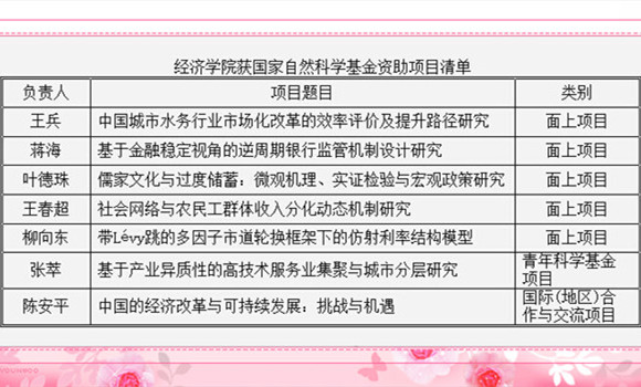 近日,2014年国家自然科学基金项目评审揭晓,我院获批7项,总获批经费达306万元。其中面上项目5项:王兵、蒋海、叶德珠、王春超及柳向东老师各获批1项;张萃老师获批青年项目1项,陈安平老师获批国际(地区)合作与交流项目1项。