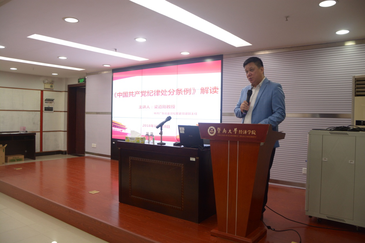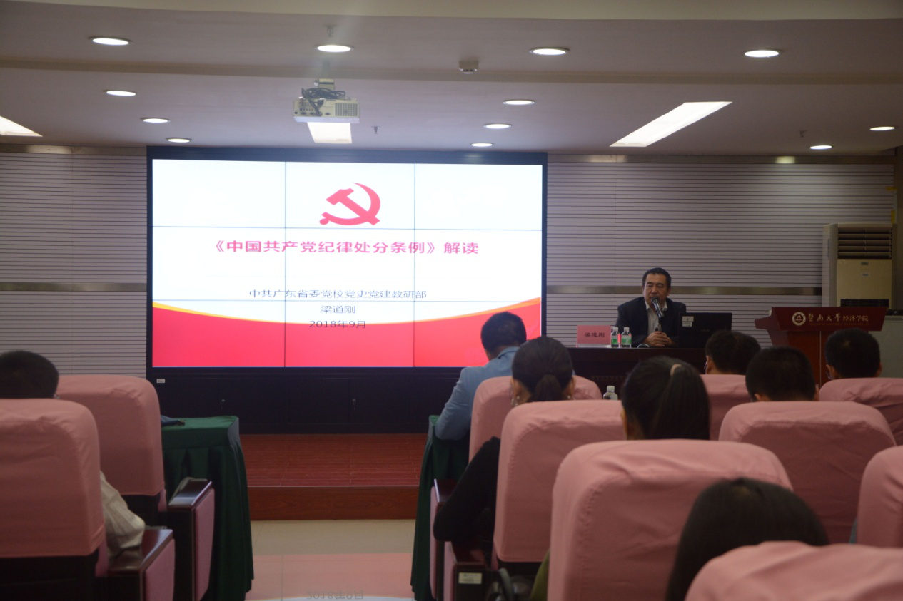 10月18日晚上,beat365英国官方网站党委在学院学术报告厅举办2018年纪律教育学习月活动,邀请中共广东省委党校党史党建部主任梁道刚教授解读《中国共产党纪律处分条例》(以下简称《条例》)专题辅导报告会。学院党委张志书记、王玉娟副书记、各职能办公室主任、各系党总支书记、学院机关支部党员以及2018级研究生党员同学共170余人参加了报告会。报告会由张志书记主持。