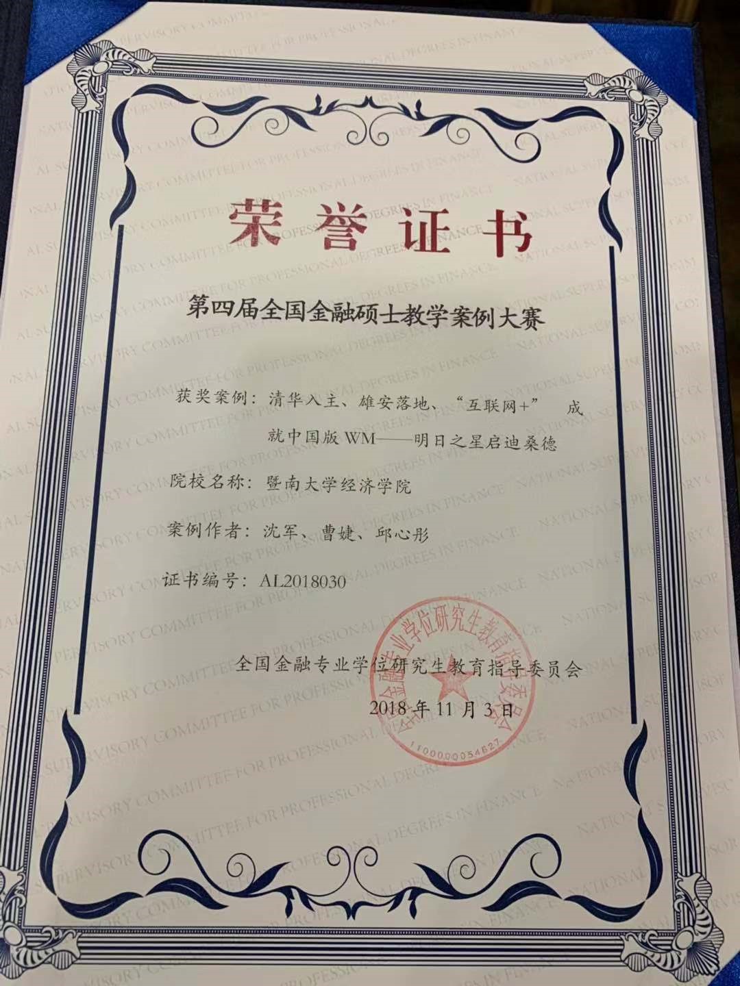 会上揭晓了第四届全国金融专业硕士案例及学位论文大赛评选结果,在271篇参赛作品中共有54篇作品获得优秀案例奖,沈军老师团队开发的案例《清华入主、雄安落地、“互联网+” 成就中国版WM——明日之星启迪桑德》获优秀案例奖,这是沈军老师团队在全国金融专业硕士案例大赛的再次获奖。