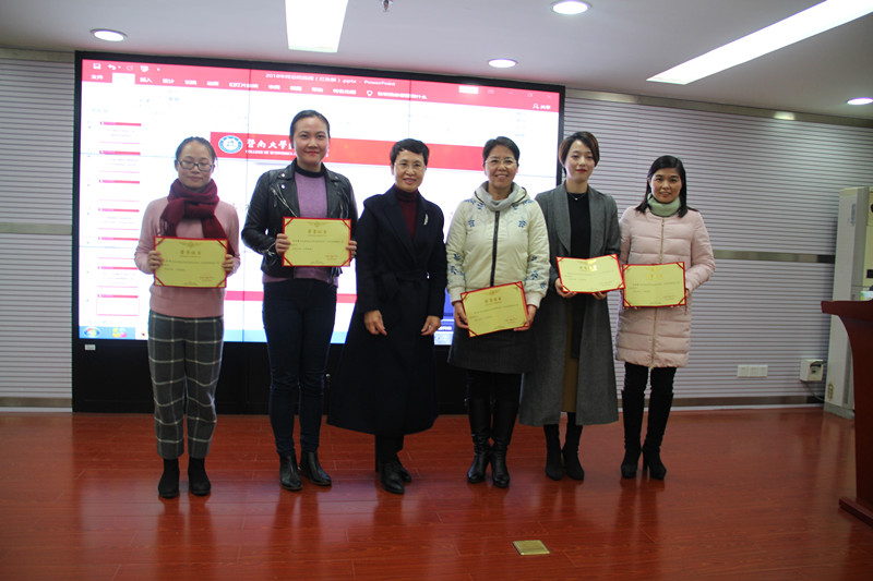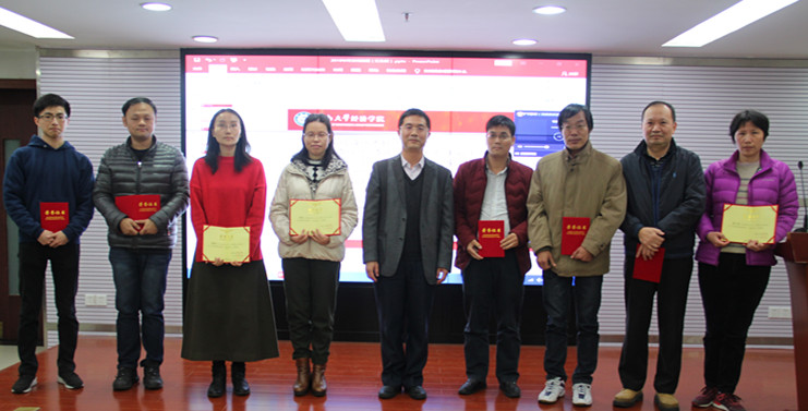 刘金山副院长宣读获得2018年科研奖励人员名单,并简要传达了2019年申报国家项目的通知要求。 蒋海副院长宣读获得2018年本科教学奖励人员名单,并为获奖老师颁奖。 王玉娟副书记宣读获得2016年优秀管理服务人员名单。5位行政人员获奖。
