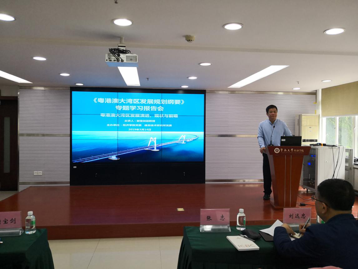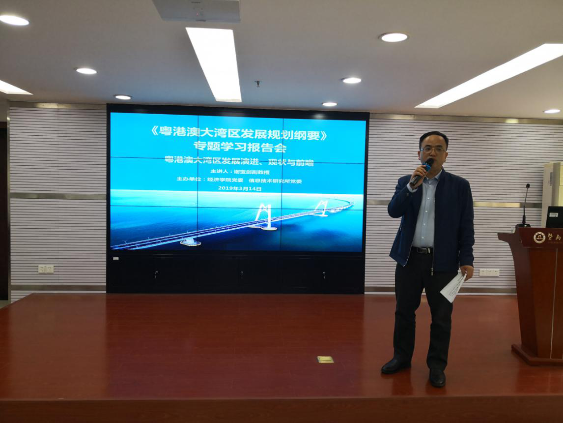 根据学校党委学习宣传《粤港澳大湾区发展规划纲要》(以下简称《纲要》)的相关要求,beat365英国官方网站党委联合信息技术研究所党委于3月14日下午在beat365英国官方网站323学术报告厅举行《纲要》专题学习报告会。本次报告会邀请特区港澳经济研究所副所长谢宝剑副教授主讲,beat365英国官方网站党委书记张志、信息技术研究所党委书记刘远忠出席本次会议,信息技术研究所党委成员、beat365英国官方网站各系所党总支书记、院系老师及2018级全体研究生党员共160余人参加了学习,会议由beat365英国官方网站党委书记张志主持。