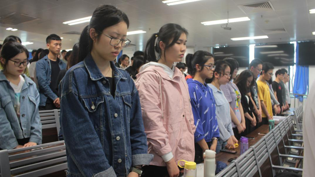 (在场师生为扑火英雄默哀)