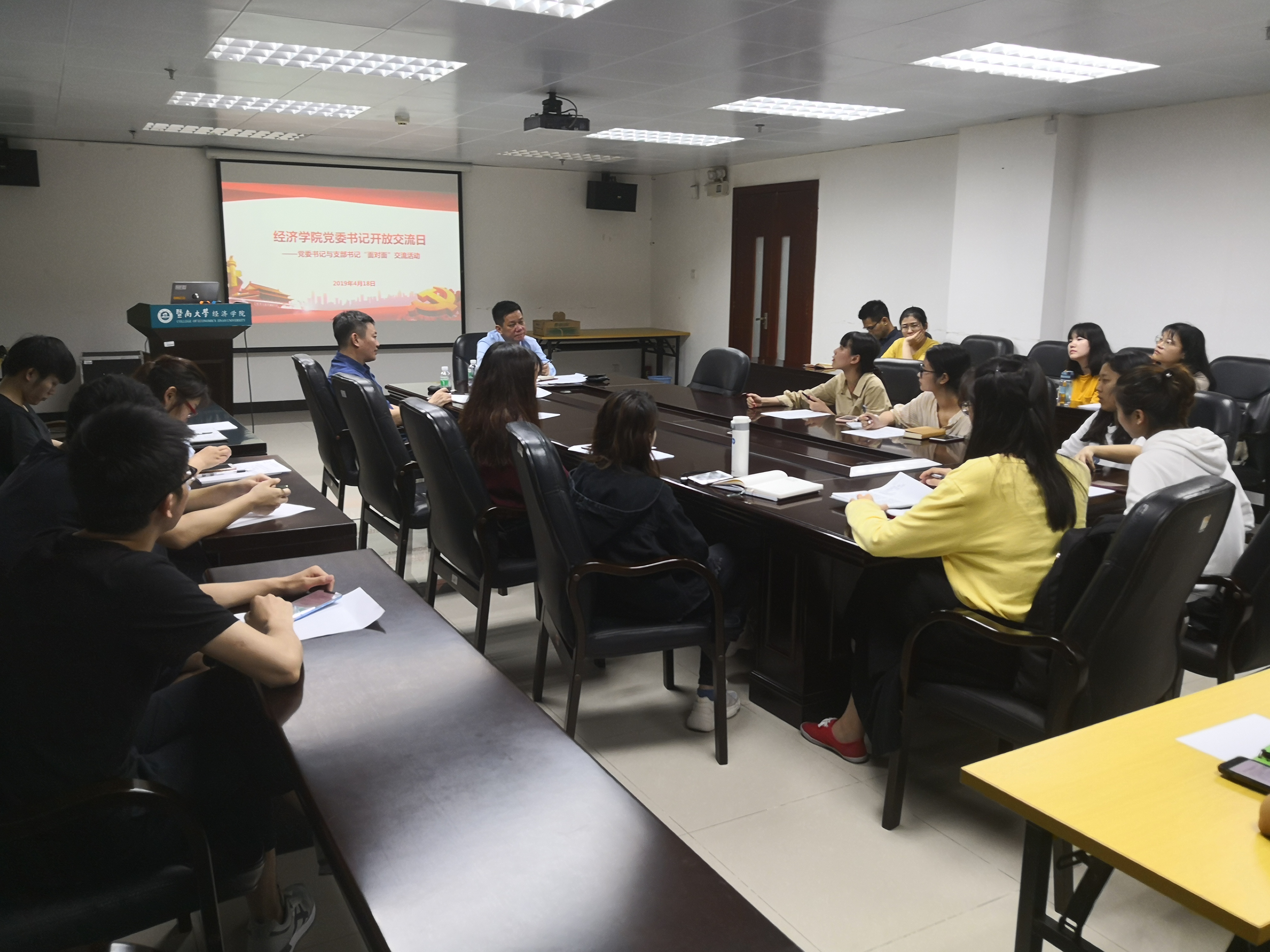 4月18日下午,按照《中共beat365英国官方网站委员会关于印发<2019年学校党委书记项目:“弘教立德、声教四海、善教致远”行动计划实施方案>的通知》(暨党发[2019]23号)(以下简称《通知》)文件要求,学院党委开展“书记开放交流日”活动,学院党委书记张志、学院党委委员钟春生与学院16个学生党支部书记、支委开展座谈交流。
