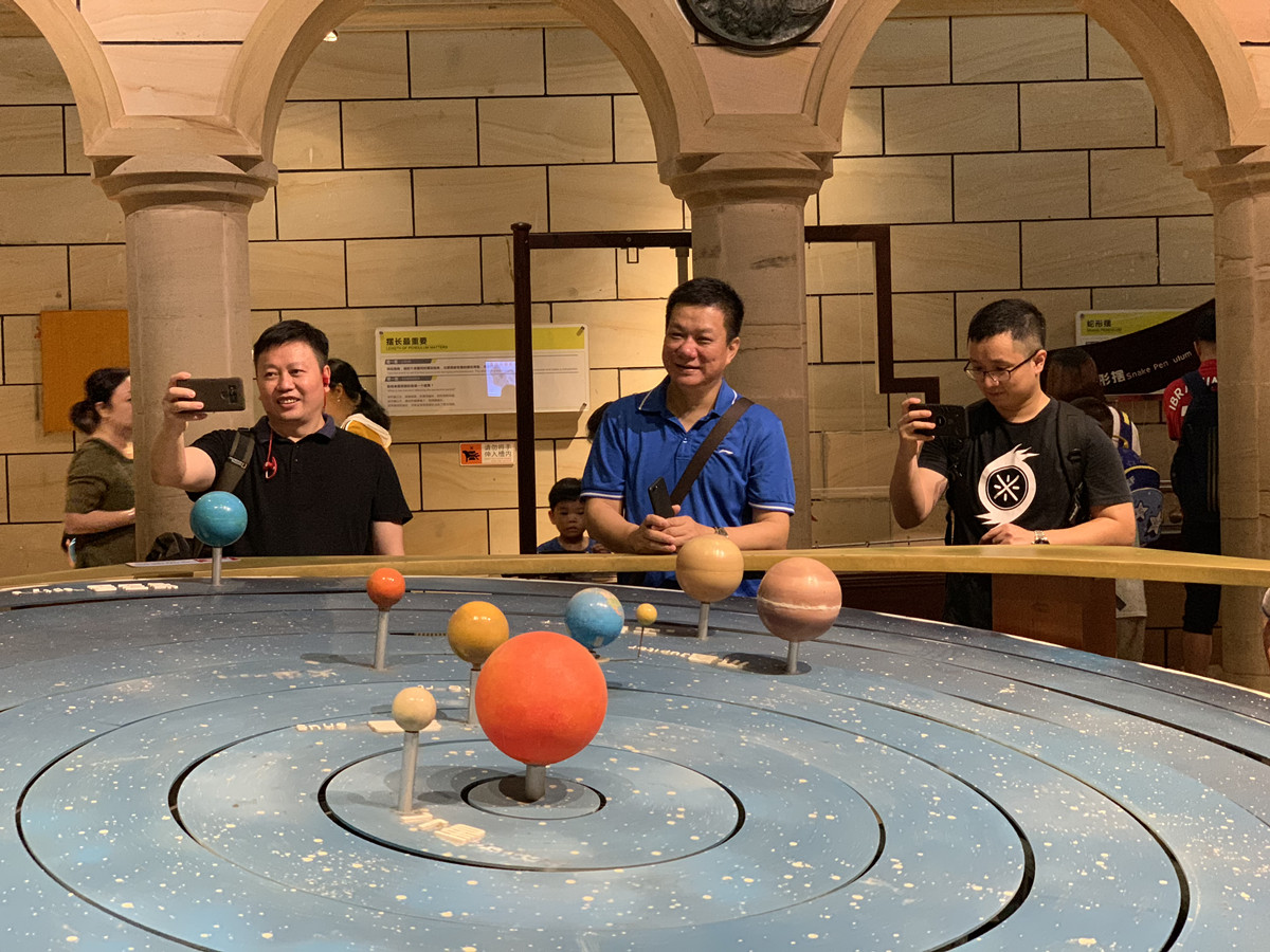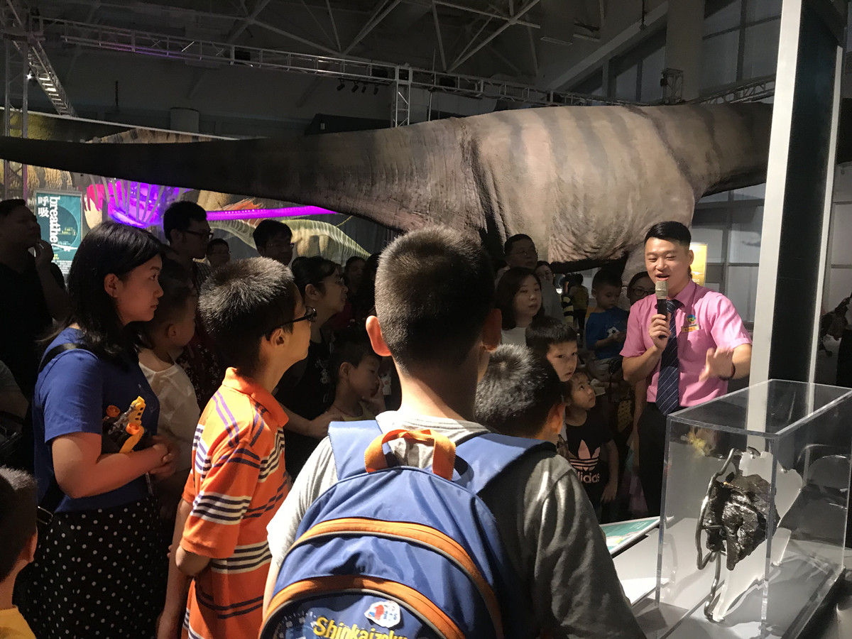 在讲解员的带领下,孩子们来到恐龙展厅,看到长颈长尾的蜥脚类恐龙骨骼,了解这些庞然大物的身体构造,理解恐龙心率、呼吸、新陈代谢和繁殖等与其庞大体型之间的关系。来到“实验与发现馆”,孩子们感受万花筒和镜面量角度,观察太阳系。最后,大家观看了“分子美食”的有趣实验。
