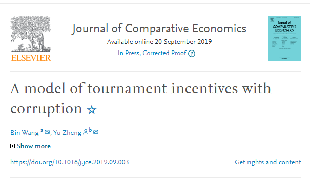 我院经济学系王彬老师与伦敦玛丽皇后大学(Queen Mary University of London)助理教授、CEPR研究员郑瑜合作的论文“A Model of Tournament Incentives with Corruption"被比较经济学领域国际顶级刊物Journal of Comparative Economics接受,该期刊为我院国际A3类期刊。