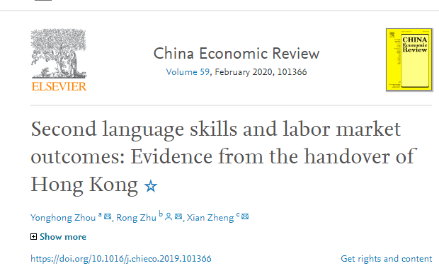 经济学系周泳宏、郑贤老师和弗林德斯大学朱荣老师的合作论文“Second language skills and labor market outcomes: Evidence from the handover of Hong Kong”在China Economic Review发表(https://doi.org/10.1016/j.chieco.2019.101366)。