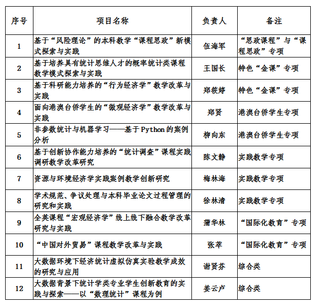 一流大学要有一流本科。在2019年首批“一流本科专业”建设点申报中,我院经济学、金融学获批成为国家级“一流本科专业”建设点,经济统计学专业获批省级“一流本科专业”建设点,而教学改革和研究是提升教师队伍人才培养能力,促进学生创新实践能力,全面提高本科教学质量,创建“一流专业”的重要抓手。学院将坚持贯彻“以本为本”,积极鼓励教师参与本科教学改革和研究,组织做好各类教改项目的建设和培育工作,及时推动项目成果付诸教学实践,不断提升人才培养能力和质量,为全面建成一流本科教育提供坚实的保障。