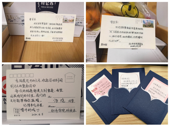 返校同学刚入住房间,学院和各系领导老师为他们准备的水果、牛奶、手写的暖心祝福等慰问品便敲门而至,让同学们倍感关怀与温暖,直呼:“爱了!爱了!”