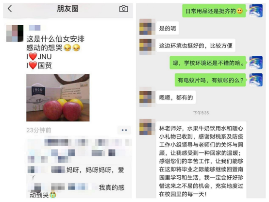 2017级金融学研究生杨逍说:“从抵达学校大门开始,一直到入住招待所,中间一连串严谨的流程都让我感觉到学校对我们湖北学生的重视,刚到招待所房间不久,来自学院的关爱便敲门而至,非常暖心和感动。这样的暨大,这样的经院,我爱了。”