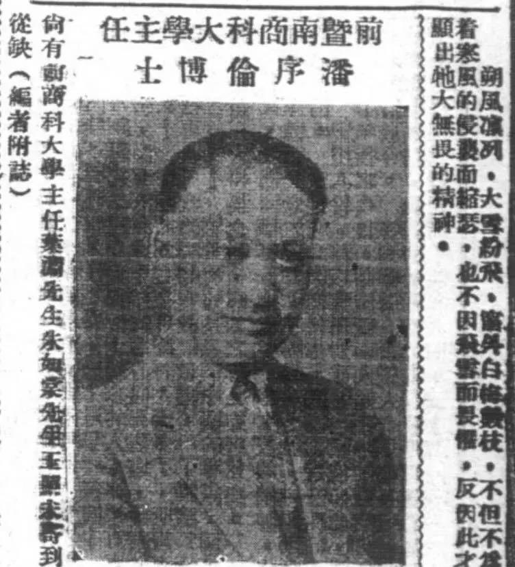“我第一次见到潘师是在国立暨南商科大学教务处前的大堂内,当时他戴了一项圆形的向上卷边的铜盆草帽,满面笑容地由火车站(上海真如火车站)走来,进入大堂之内,再转入教务处。可是,教务处的大门正在装修玻璃,未能即时进去,只好回出来同其他教授谈笑风生地商谈事情。不久,他又想转入教务处,可是大门仍未修妥。他对修理工说,再过五分钟,我一定要进去。结果,等了一阵,终于进入了教务处。此时已有许多学生在教务处等他解决关于学科和学分的问题,同时也有若干教授来同他商量关于教课的问题。他干净利落地一一处理完毕,使他们满意而归。不久,上课铃一响,他即带了教科书上课去了。当时有一位同学在我旁边,就对我说:‘毕竟是博士,一切照规定的原则办理,处事爽快,真是难得。’