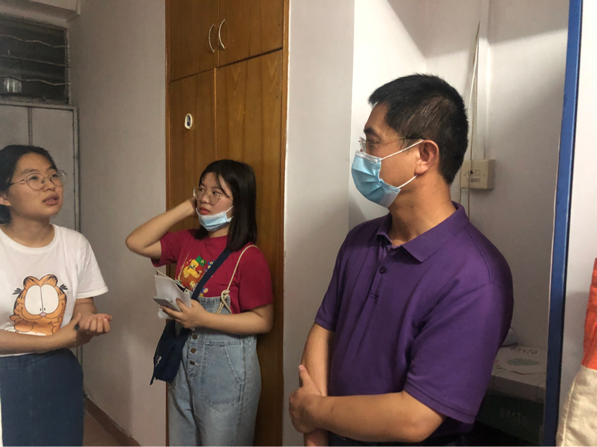 学院党委副书记熊媛媛、学科建设与研究生培养办副主任刘昂与研究生会学生组成另一小队同时进行走访。学生在学校的适应情况、疫情期间的防护和与导师的沟通仍然是老师们的关心重点。熊媛媛副书记认真询问了学生寝室的卫生状况、学生对食堂餐饮的反馈和返校的学习安排、未来计划等,勉励同学们珍惜时间,好好学习。刘昂副主任提醒同学们要严格遵守学校疫情防控规定,齐心维护校园安全,导师和学院其他老师都是可寻求帮助的对象。学生们对老师们的关心也给予了积极反馈,表示一定会遵守学校防疫规定,努力适应,协调好学习和生活。