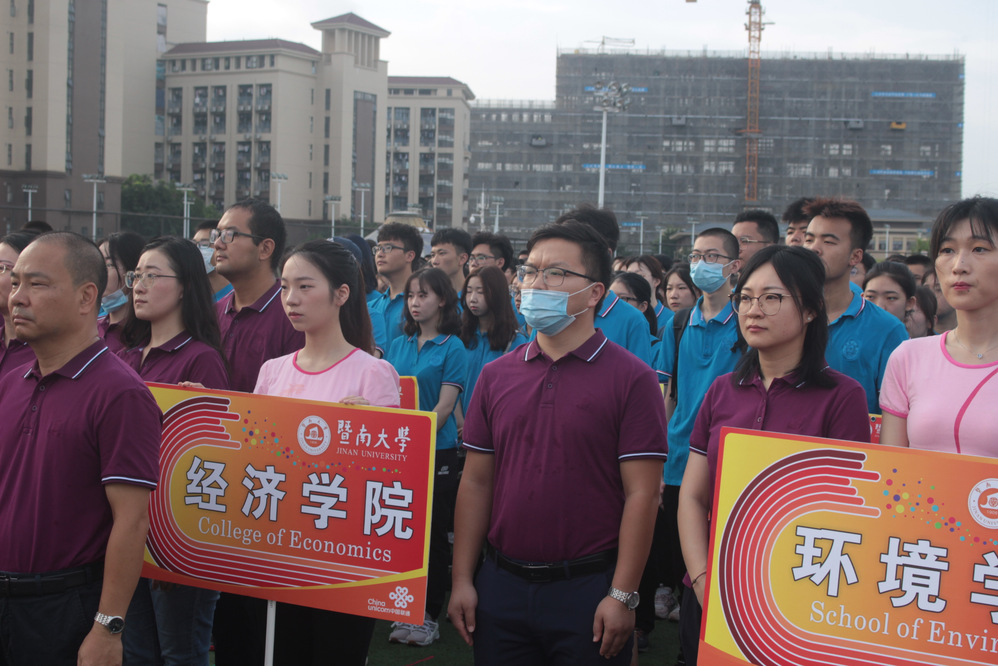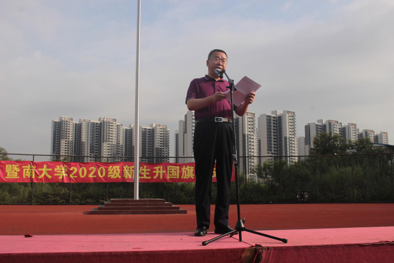 随后,张荣华副校长发表了国旗下讲话,他提出爱国是每个人应尽的责任与义务,热爱祖国更是立身之本、成才之基。他强调我们大学生应该将爱国情怀付诸于行动之中,时刻心怀天下,将个人理想与国家命运紧密联系起来,在奉献祖国、奉献人民中实现自己的人生理想。同时,张荣华校长还对2020级新生们提出殷切期望:一是珍惜时光,练就过硬本领;持之以恒,锤炼高尚品质,他希望同学们能够心无旁骛专心学习专业知识,在思考实践中积累宝贵经验,充分发挥创新精神推动实践创新,不断进取;二是向上向善,保持积极乐观的人生态度,不论人生逆境或是顺境都能够沉着应对,让这种经历成为人生的宝贵财富。最后,他表示beat365英国官方网站的同学们都应该志存高远、脚踏实地,深入贯彻习近平总书记在beat365英国官方网站的重要讲话精神,努力弘扬暨南精神,谱写暨南能量,为中华民族伟大复兴的中国梦贡献暨南人的青春力量!