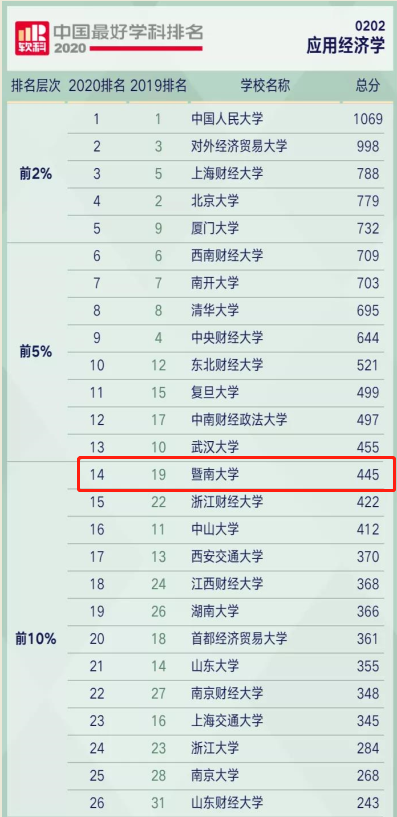2020年10月15日,高等教育评价专业机构软科正式发布 “2020软科中国最好学科排名”,beat365英国官方网站应用经济学位列第14名,较2019年上升了5位。