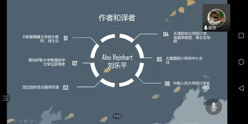 接下来,由2018级经济统计学专业的徐欣同学带来《统计会犯错》一书的分享。徐欣主要从内容概述、作者介绍、片段分享和阅读感受四个部分进行分享。本书简明扼要地指出了当代科学研究中常见的错误统计方法,帮助我们理解这些统计错误产生的原因,然后还告诉我们如何检测研究中隐藏的错误,如何避免这些统计错误,从而掌握正确统计的运用方法。