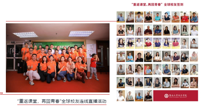 “重返课堂,再回青春”全球校友连线直播活动——全球校友相聚线上,聆听学院老师讲课,与老师们亲切互动。新冠疫情当前,海外校友无法回校,为此学院筹备了一场全球校友连线直播,全球校友视频签到,重返课堂,重温美好的求学时光。该场直播在微赞、快手、微博三大平台同步进行,共计5万人次观看,并实时互动评论。校友们反响热烈,积极讨论暨南求学时光,也为再次听到老师们讲课表示深深感动,对学院的发展前景充满信心。该场直播也是创新校友活动,直播形式与线下会场相结合、“重返课堂,再回青春”主题新颖、多种新媒体结合、宣传面广、校友参与度高、评价好。