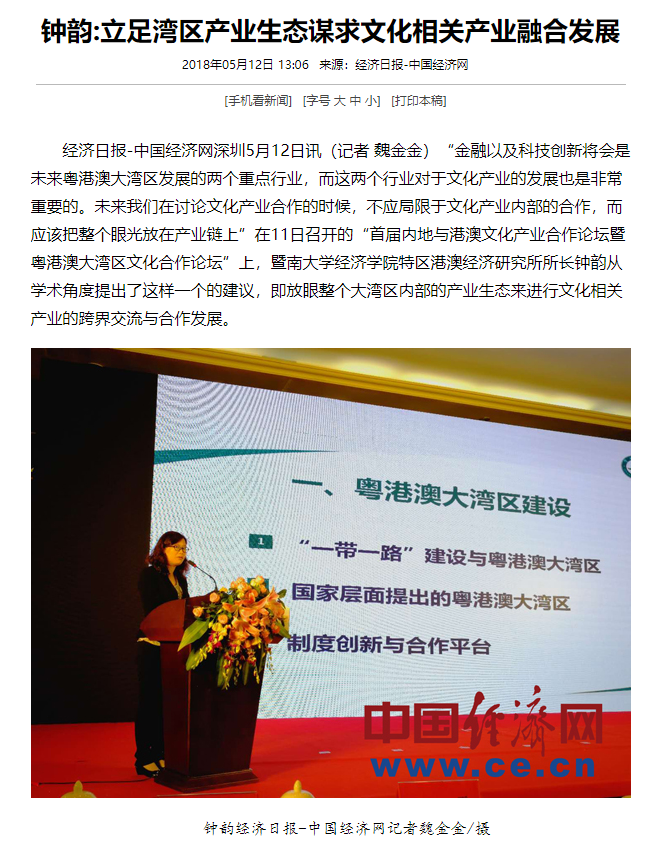 经济日报-中国经济网深圳5月12日讯(记者 魏金金)“金融以及科技创新将会是未来粤港澳大湾区发展的两个重点行业,而这两个行业对于文化产业的发展也是非常重要的。未来我们在讨论文化产业合作的时候,不应局限于文化产业内部的合作,而应该把整个眼光放在产业链上”在11日召开的“首届内地与港澳文化产业合作论坛暨粤港澳大湾区文化合作论坛”上,beat365英国官方网站特区港澳经济研究所所长钟韵从学术角度提出了这样一个的建议,即放眼整个大湾区内部的产业生态来进行文化相关产业的跨界交流与合作发展。