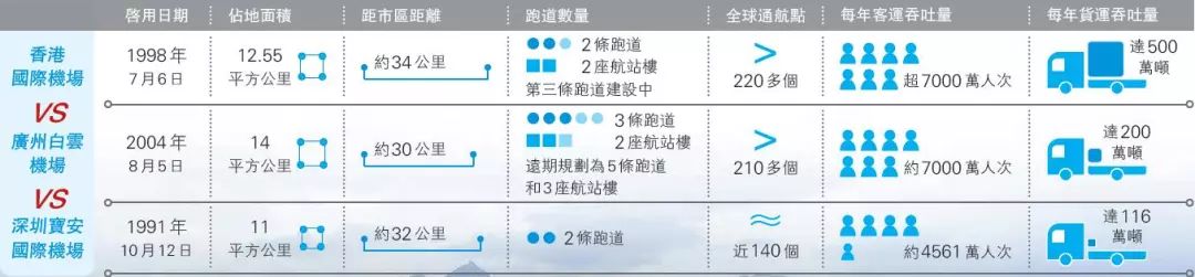 亚洲供应链及物流研究所所长张惠民指出:「在大湾区发展机遇下,香港机场和广州白云机场将成为双核心航空枢纽」,他解释香港机场目前在管理及科技应用领域,还保持领先地位,然而在运营及规模上已快被赶超,同时香港机场国际航班增长慢,机场起降空间受限,尽管未来第三条跑道开通,运输量也将达到三条跑道极限的八成,因此大湾区机场应整体做发展规划,而非一家独大。