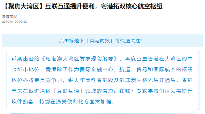 近期出台的《粤港澳大湾区发展规划纲要》,再度凸显香港在大湾区的中心城市地位,香港除了作为国际金融中心,航运、贸易和国际航空的枢纽地位亦将更具竞争力。继去年高铁香港段及港珠澳大桥先后开通后,香港未来在促进湾区「互联互通」领域的着力点在哪?专家学者们认为需提升软件配套,特别在通关便利化方面需加强。