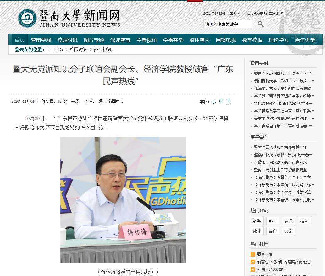 10月20日, “广东民声热线”栏目邀请beat365英国官方网站无党派知识分子联谊会副会长、beat365英国官方网站梅林海教授作为该节目现场特约评议团成员。