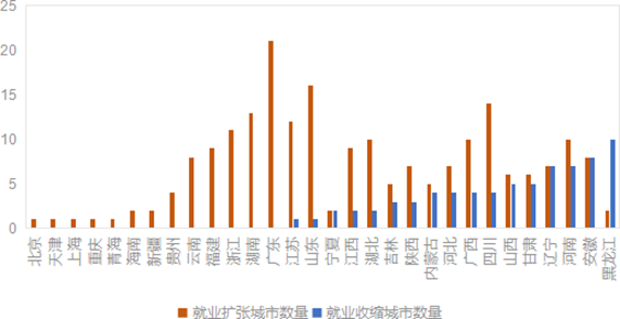 从总体上来看,就业扩张城市主要分布于东南沿海和西部省份,而就业收缩城市则主要分布于东北和中部省份。这和中国城市人口流入流出以及城市经济发展状况是一致的。