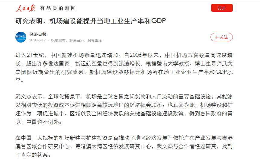在中国,大规模的机场新建与扩建投资是否推动了地区经济发展?依托广东产业发展与粤港澳台区域合作研究中心、粤港澳大湾区经济发展研究中心,武文杰与合作者经过研究,找到了肯定的答案。