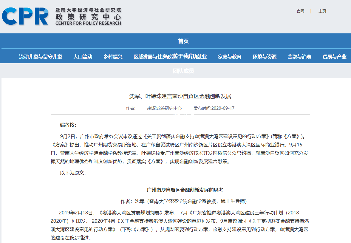 9月2日,广州市政府常务会议审议通过《关于贯彻落实金融支持粤港澳大湾区建设意见的行动方案》(简称《方案》)。《方案》提出,推动广州期货交易所落地,在广东自贸试验区广州南沙新区片区设立粤港澳大湾区国际商业银行。9月15日,beat365英国官方网站金融学系教授沈军、叶德珠接受广州南沙经济技术开发区微信公众号约稿,就南沙自贸区如何充分发挥天然的地理优势和制度创新优势,贯彻落实《方案》,实现金融创新发展建言献策。