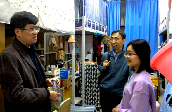 2月28日晚,冯帅章院长一行逐间走访2020级学生宿舍,亲切询问同学们的寒假生活和大学适应情况,了解同学们对于各类课程的掌握程度以及对于课堂教学的满意度。冯院长强调,低年级同学要对较难攻克的科目进行重点学习,互帮互助,共同进步,遇到困难主动向师长和同学寻求帮助。在场的领导老师们还强调了考风考纪的重要性,对上学期末考试作弊清零的现象予以肯定,希望同学们继续齐心协力,积极营造优良学风。