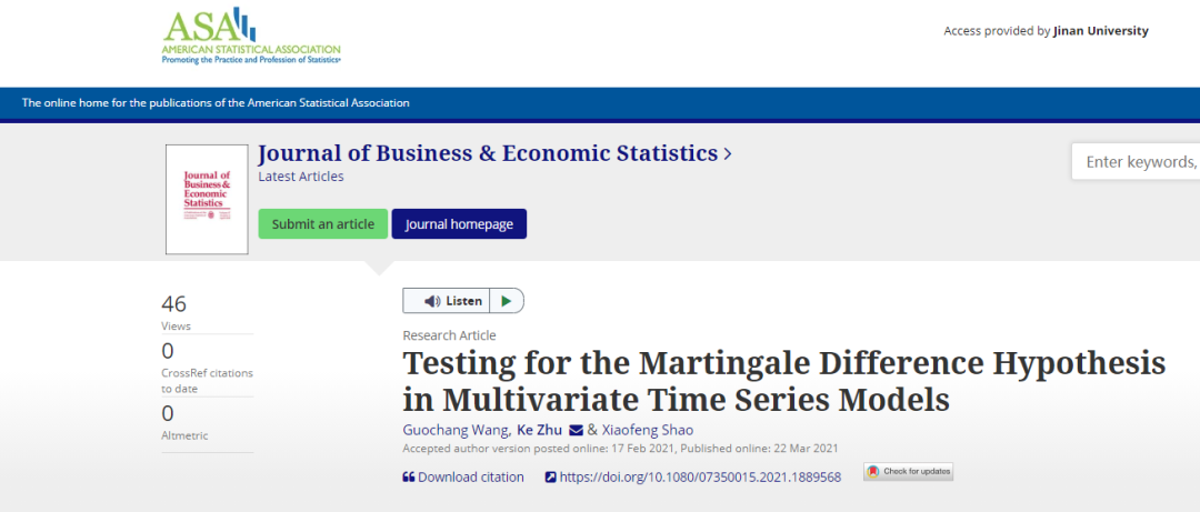 近日,以我院统计学系王国长副教授为第一作者的论文在Journal of Business & Economic Statistics在线发表,论文题目为"Testing for the martingale difference hypothesis in multivariate time series models",合作者为香港大学朱柯助理教授和美国伊利诺伊大学厄巴纳-香槟分校邵晓峰教授。该期刊为统计学与计量经济学领域的国际权威期刊。
