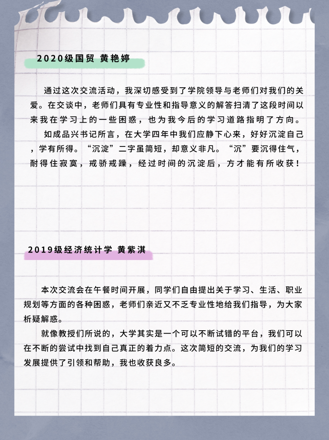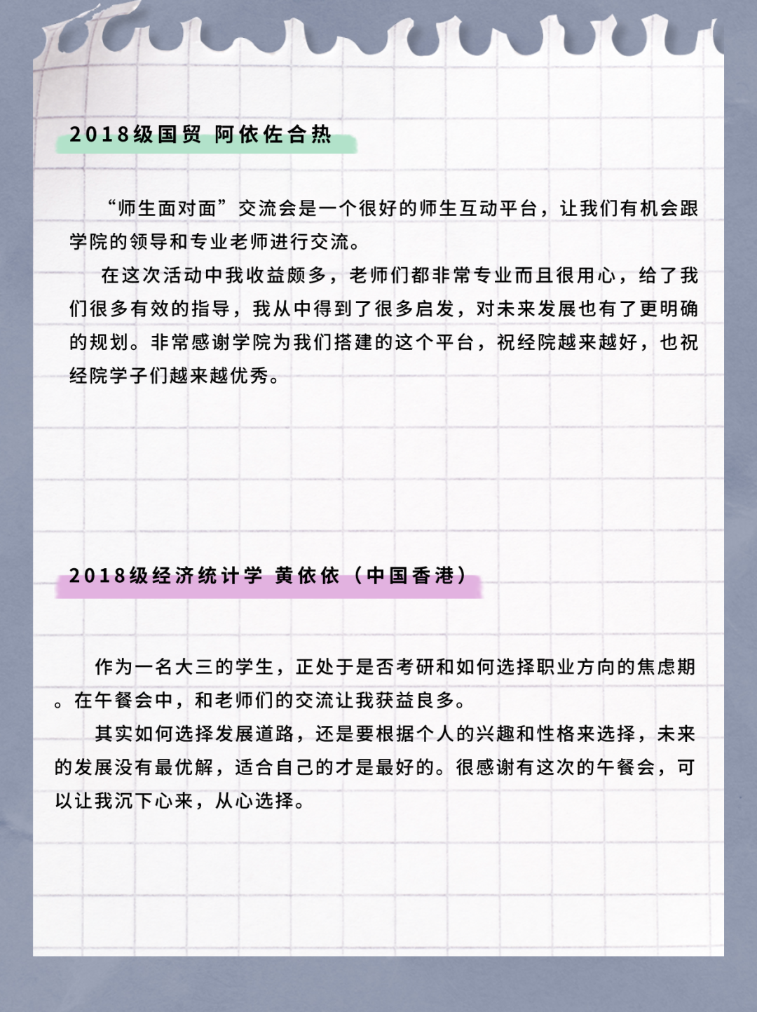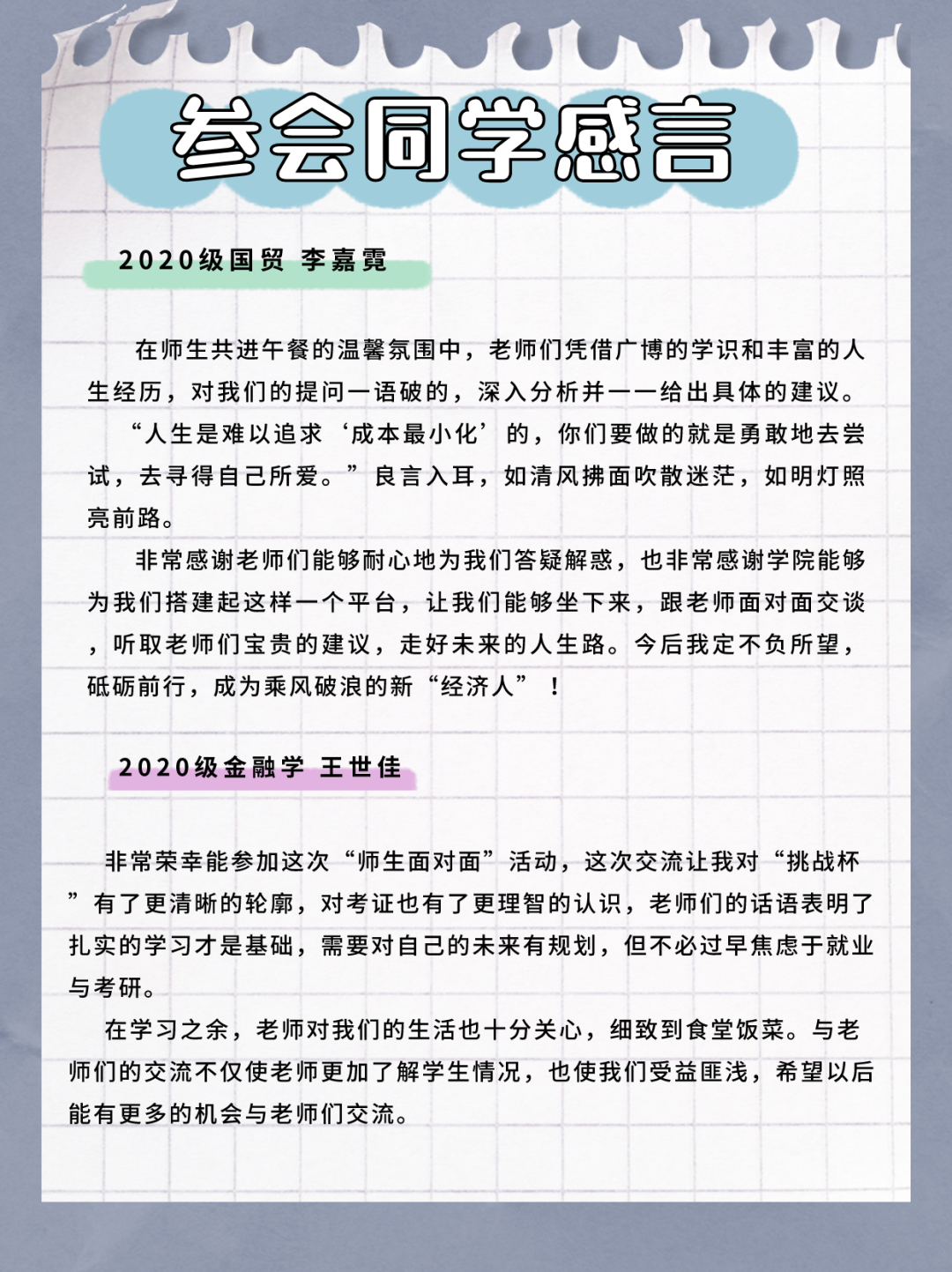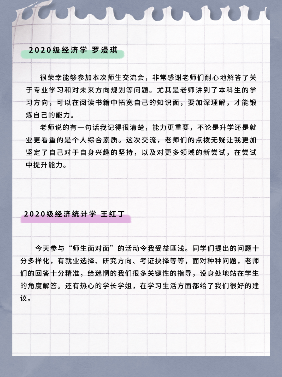 学生的学习与发展一直是学院领导老师关心关注的问题,参会同学结合大学生涯的不同阶段,和老师们积极互动。高年级同学比较关注实习就业和外招生考研政策等内容,低年级同学则更关注“如何探索适合自己的学术研究方向”“如何做好‘挑战杯’项目”“大二阶段适合看哪些学术期刊”“考证是否有必要”等问题。