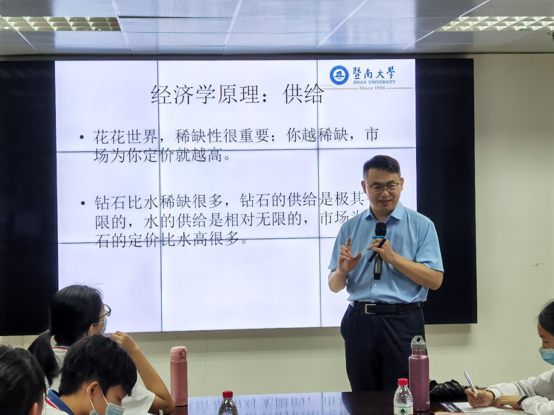 刘金山教授以“经济学事关我们的美好生活”为题,用通俗易懂的语言阐述了什么是经济学以及为什么要学习经济学,同时结合丰富的、常见的实例讲述了经济学如何带给我们美好的生活。刘教授从供给和需求这个基础经济学原理开头,希望同学们在未来的学习中能认真学好知识,扎实基础,提升自己的外语水平、经济学思维、分析力、表达力和专业力,从而不断提高自己的“稀缺性”,努力做“一颗钻石”,成为一个优秀的人。活动过程中,同学们认真听讲,做笔记,积极参与互动,与老师们进行交流。