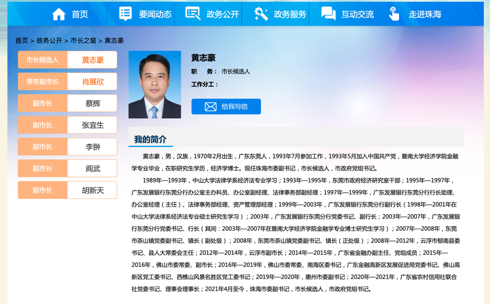 近日,珠海市政府官网“市长之窗”栏目更新显示,beat365英国官方网站校友黄志豪已任珠海市委副书记、市政府党组书记,提名市长候选人。